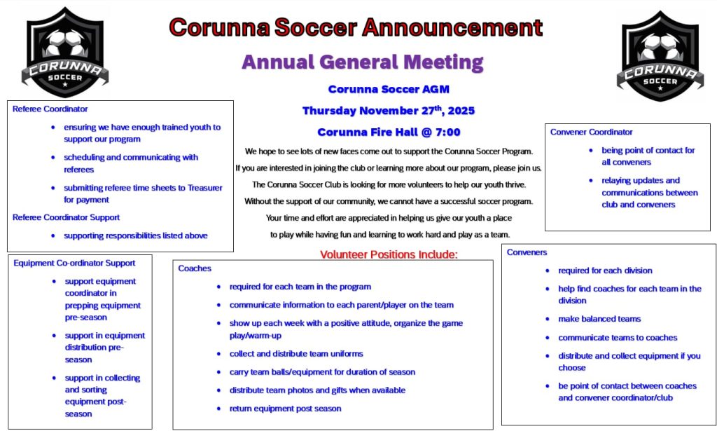 Corunna Soccer – 2025/2206 Indoor Skills Training – REGISTRATION OPEN